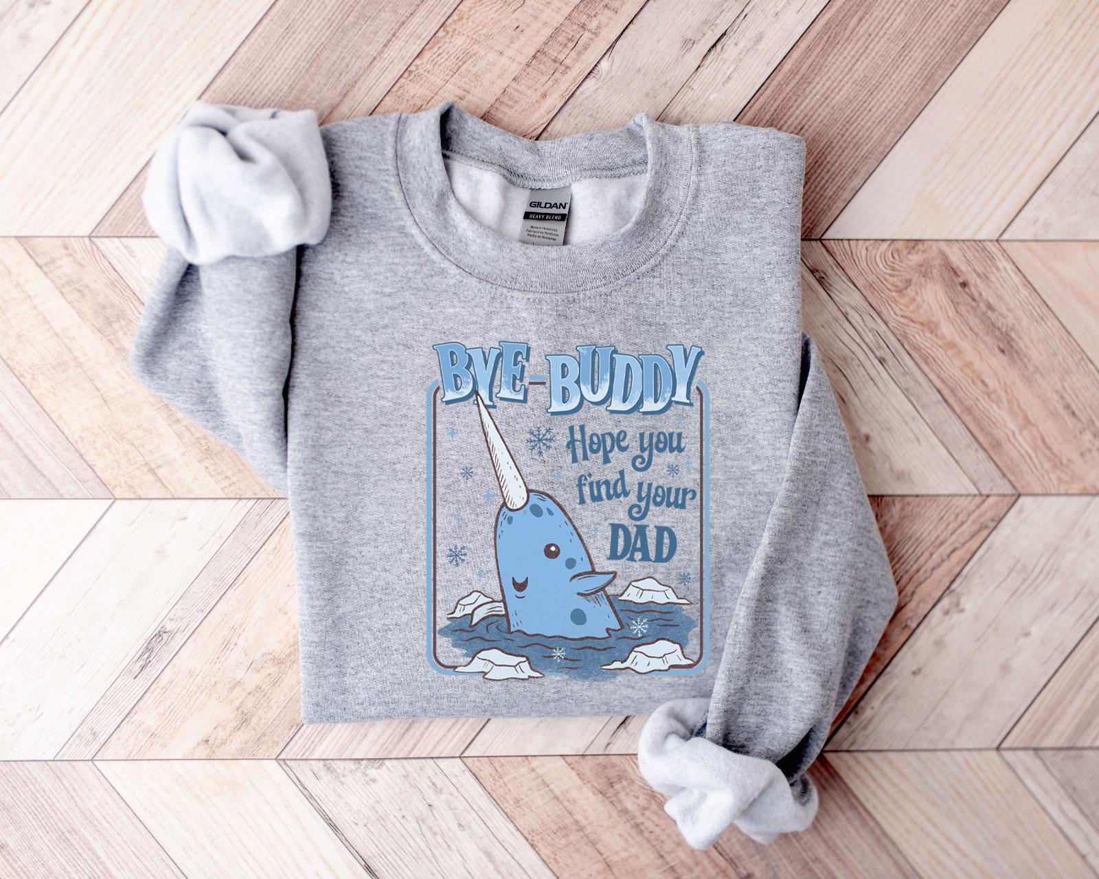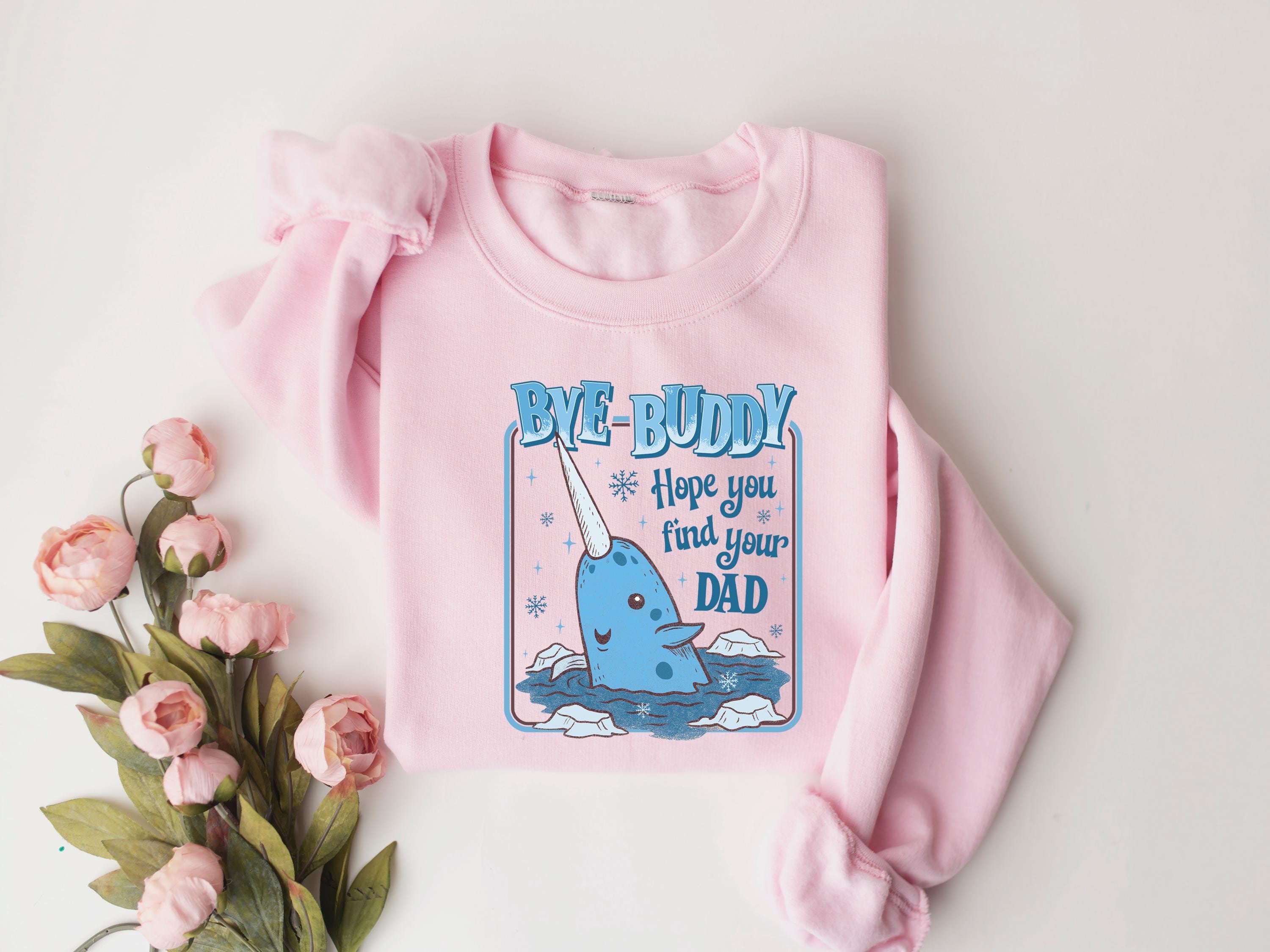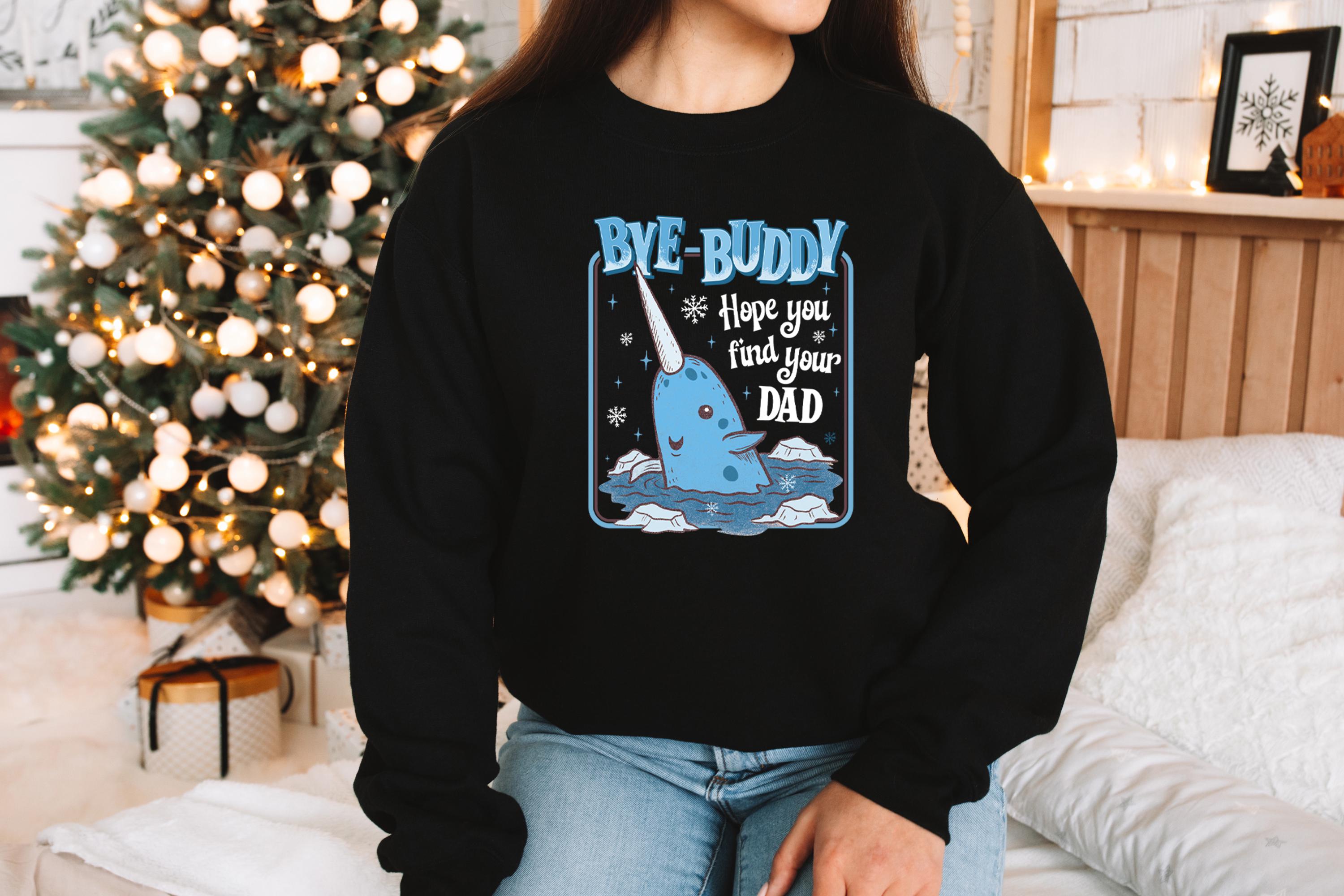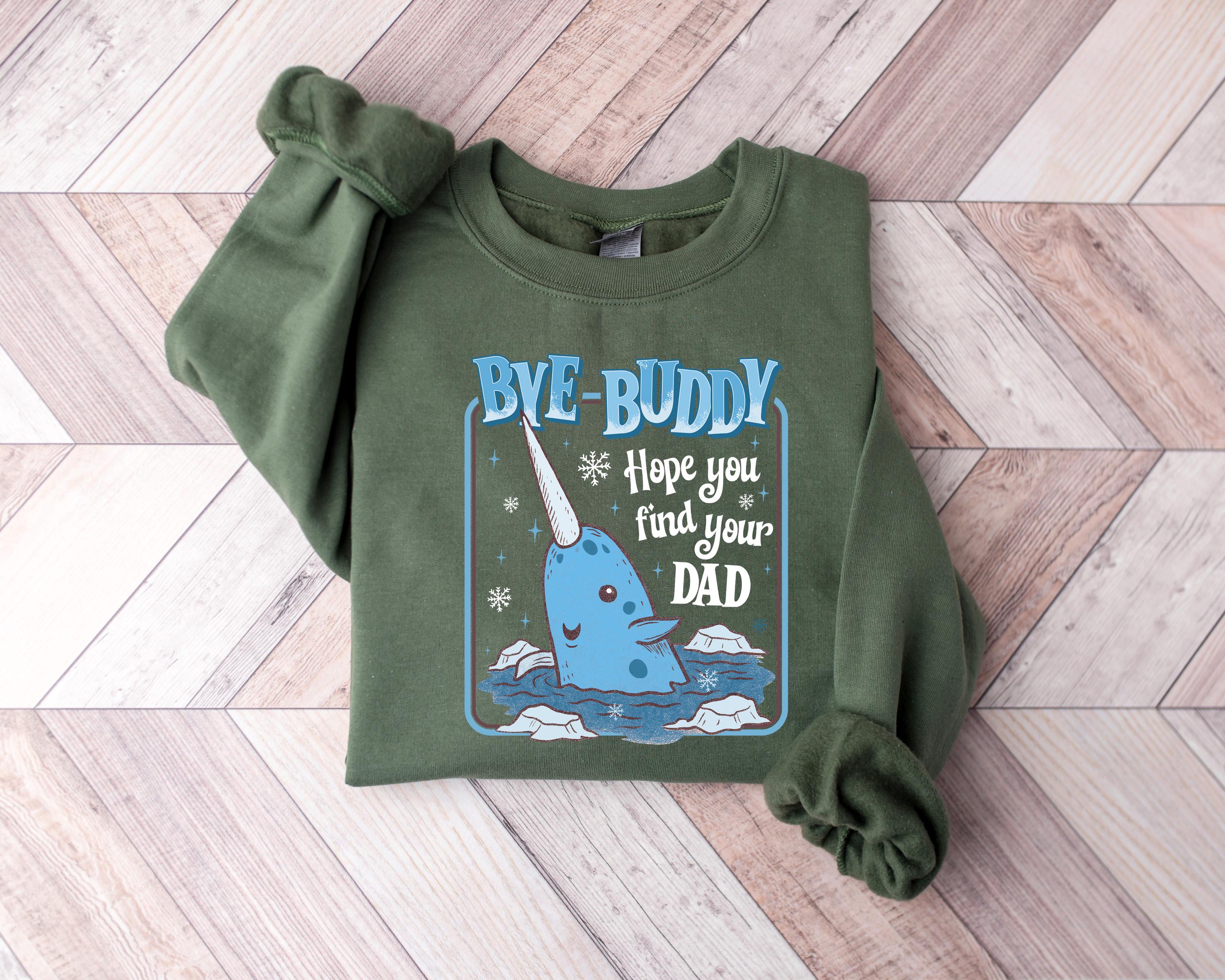 ✨ Bye Buddy Hope You Find Your Dad Sweatshirt, Gildan 18000 Heavy Blend Crewneck for Women & Men, Cozy Christmas Classic Movie Outfit, Buddy Narwhal Xmas T-Shirt, Printify Choice, Festive Whale Gift ✨