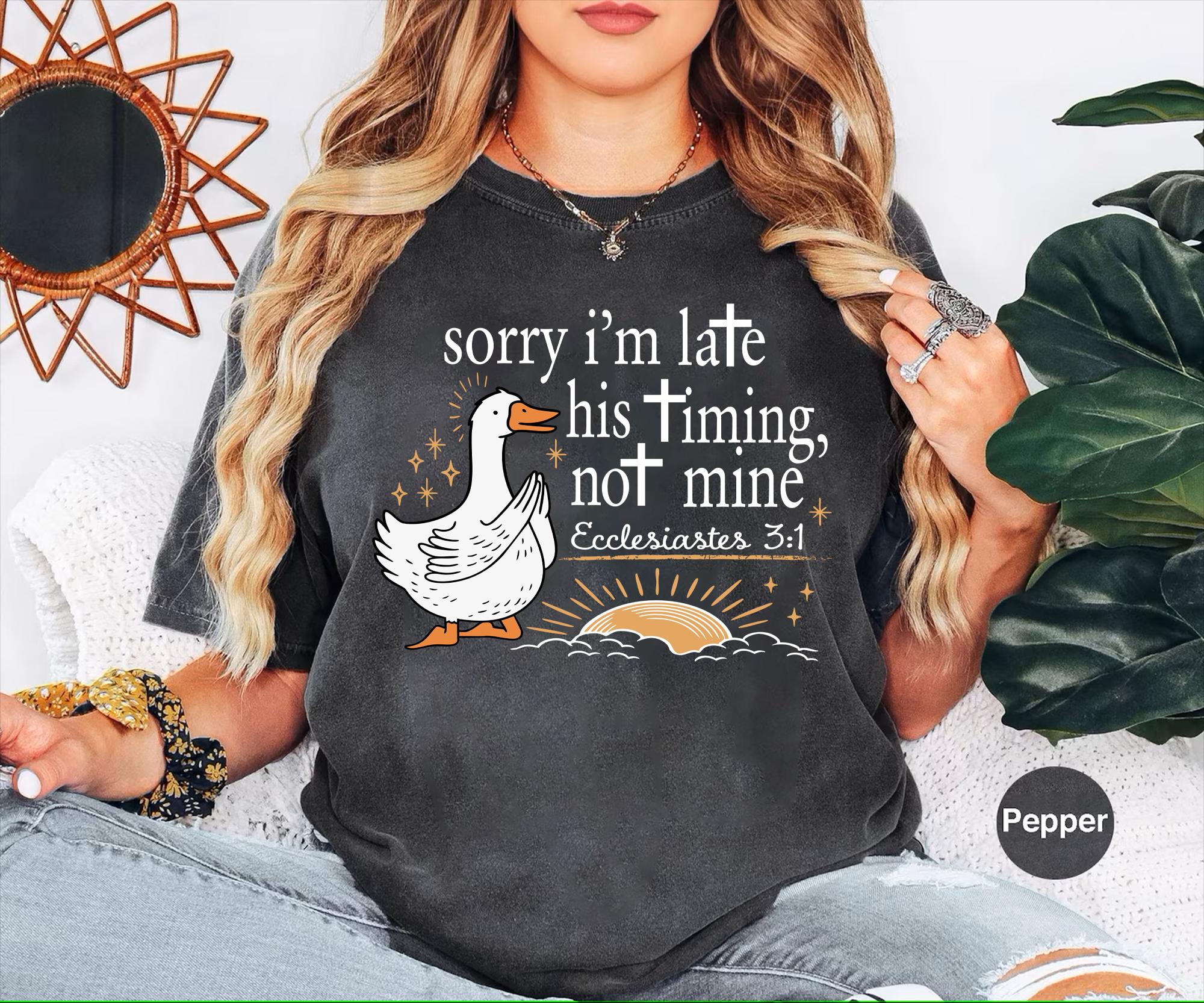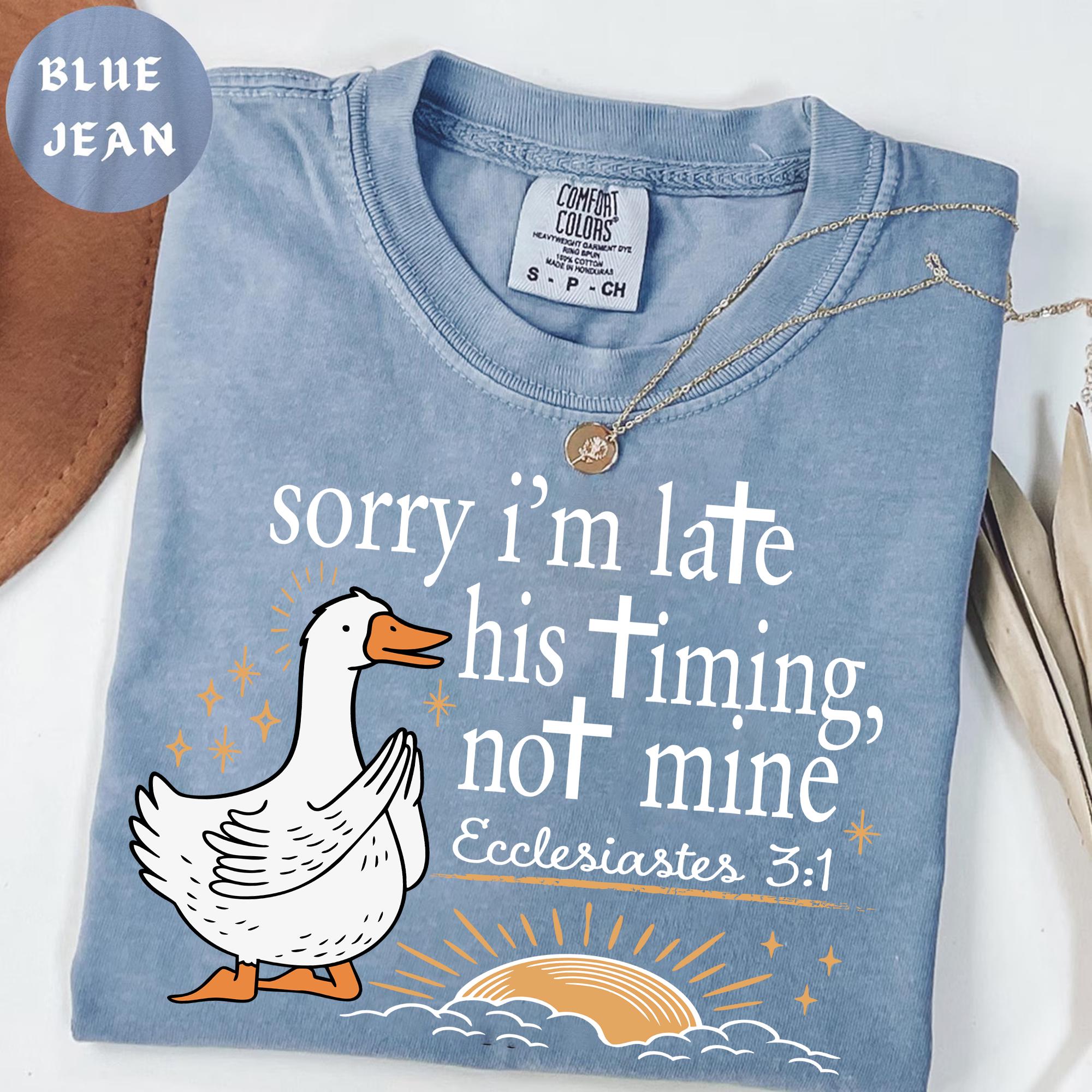 Comfort Colors® 1717 Christian Tee, "Sorry I'm Late" SwiftPOD Shirt, Unisex Garment-Dyed Gift, Bible Verse Ecclesiastes 3:1, Faith Outfit for Women