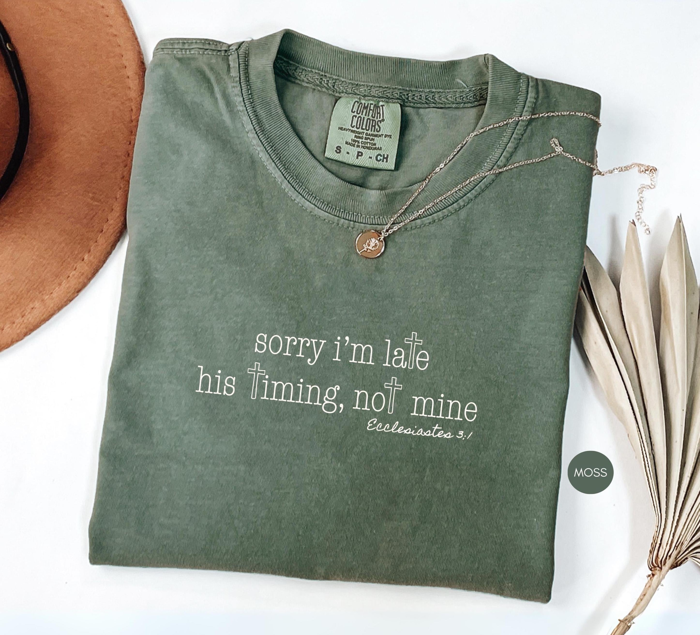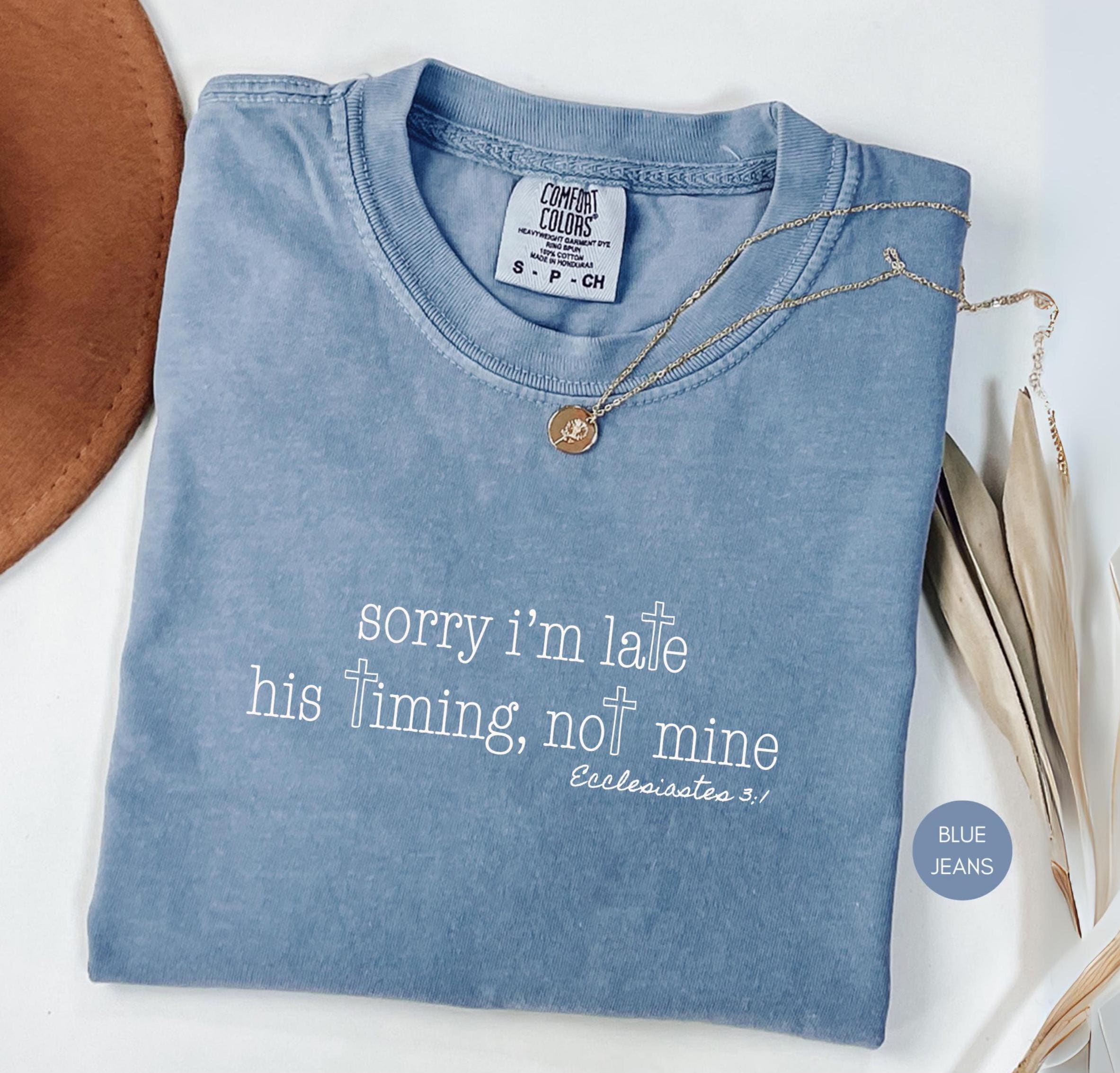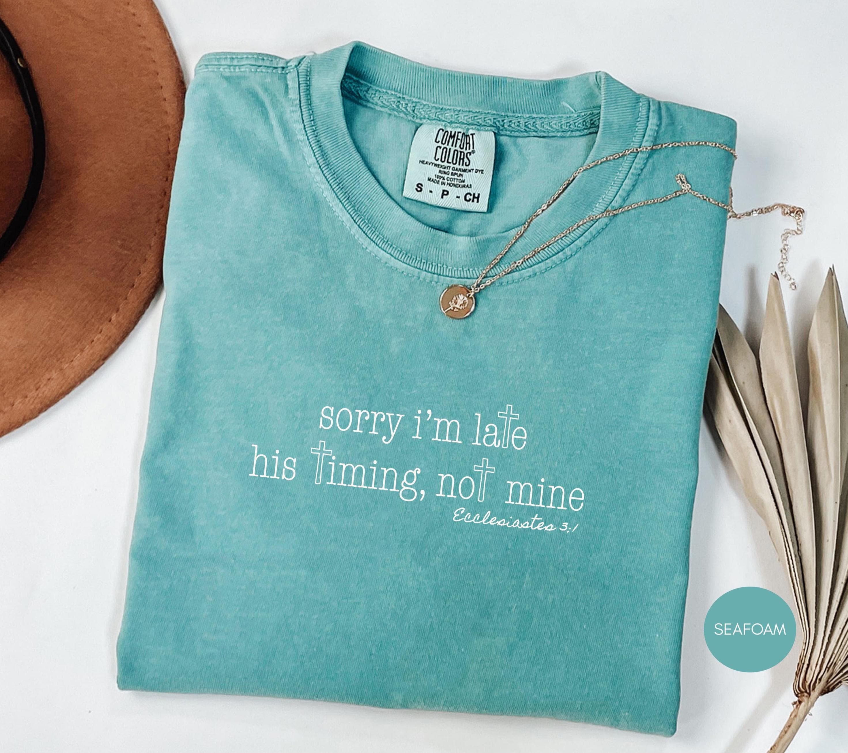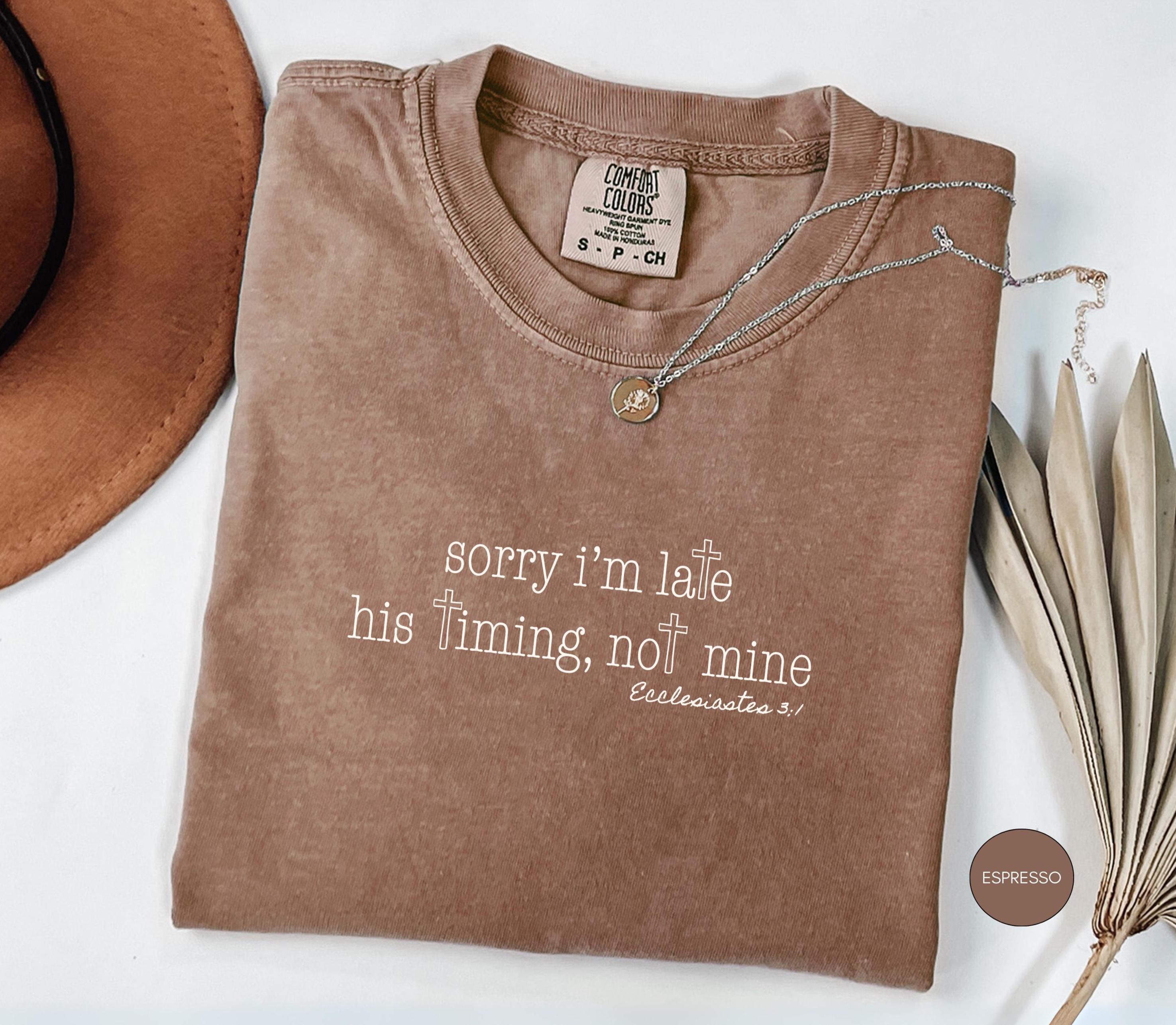 Comfort Colors® 1717 Unisex Christian Shirt - "Sorry I'm Late His Timing Not Mine" Bible Verse Tee, Perfect Gift for Faithful Men & Women by SwiftPOD