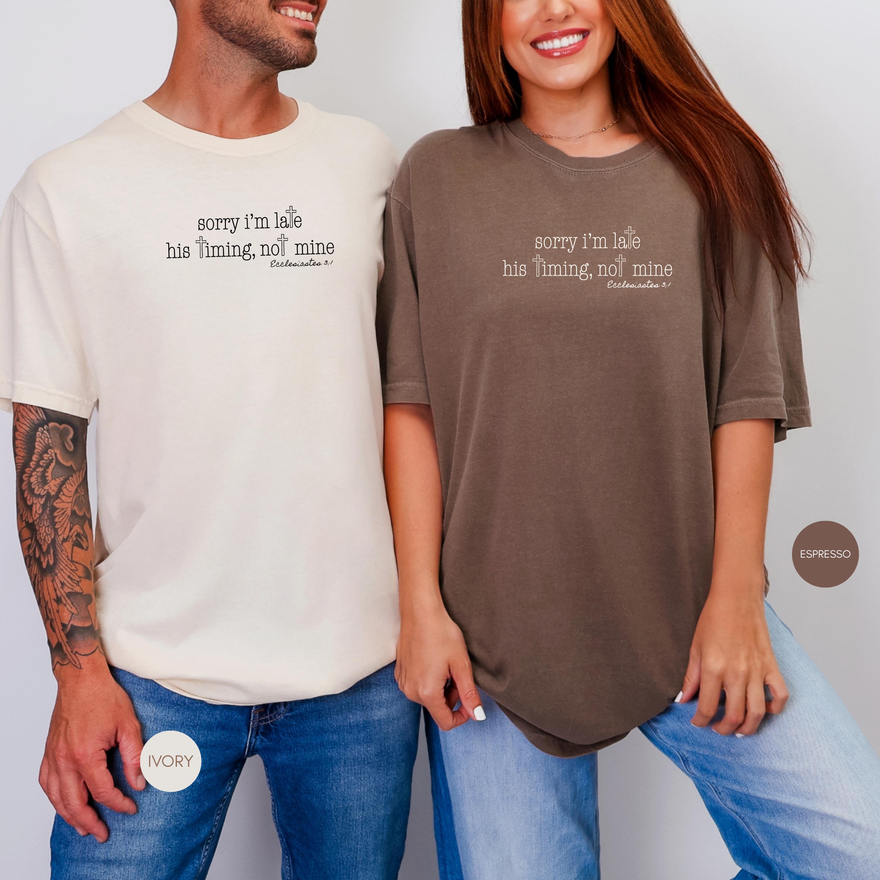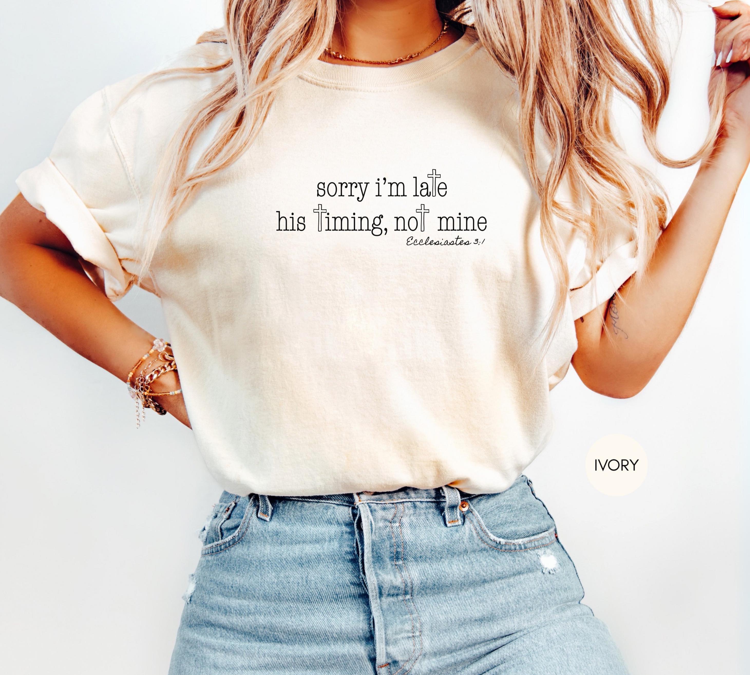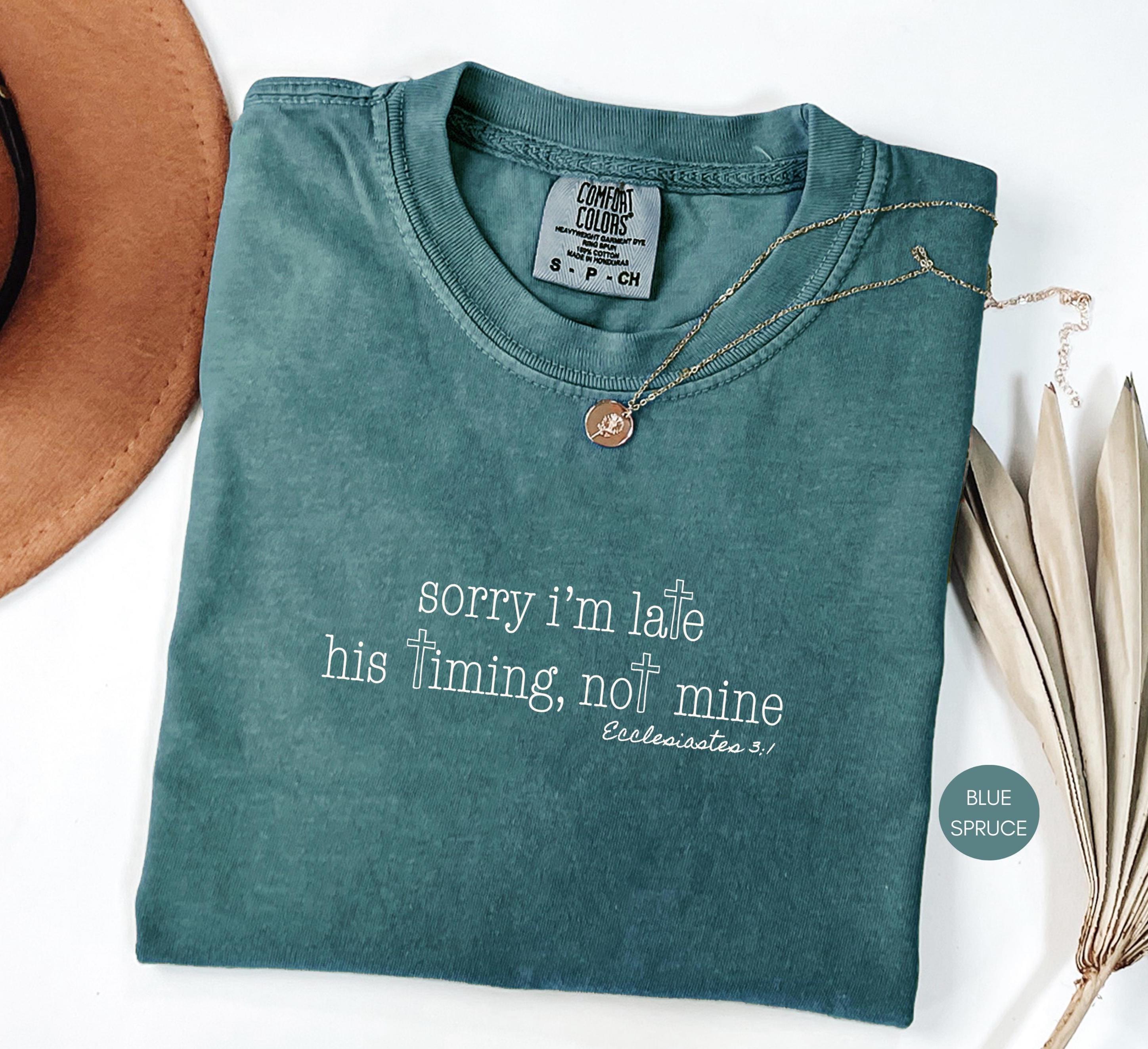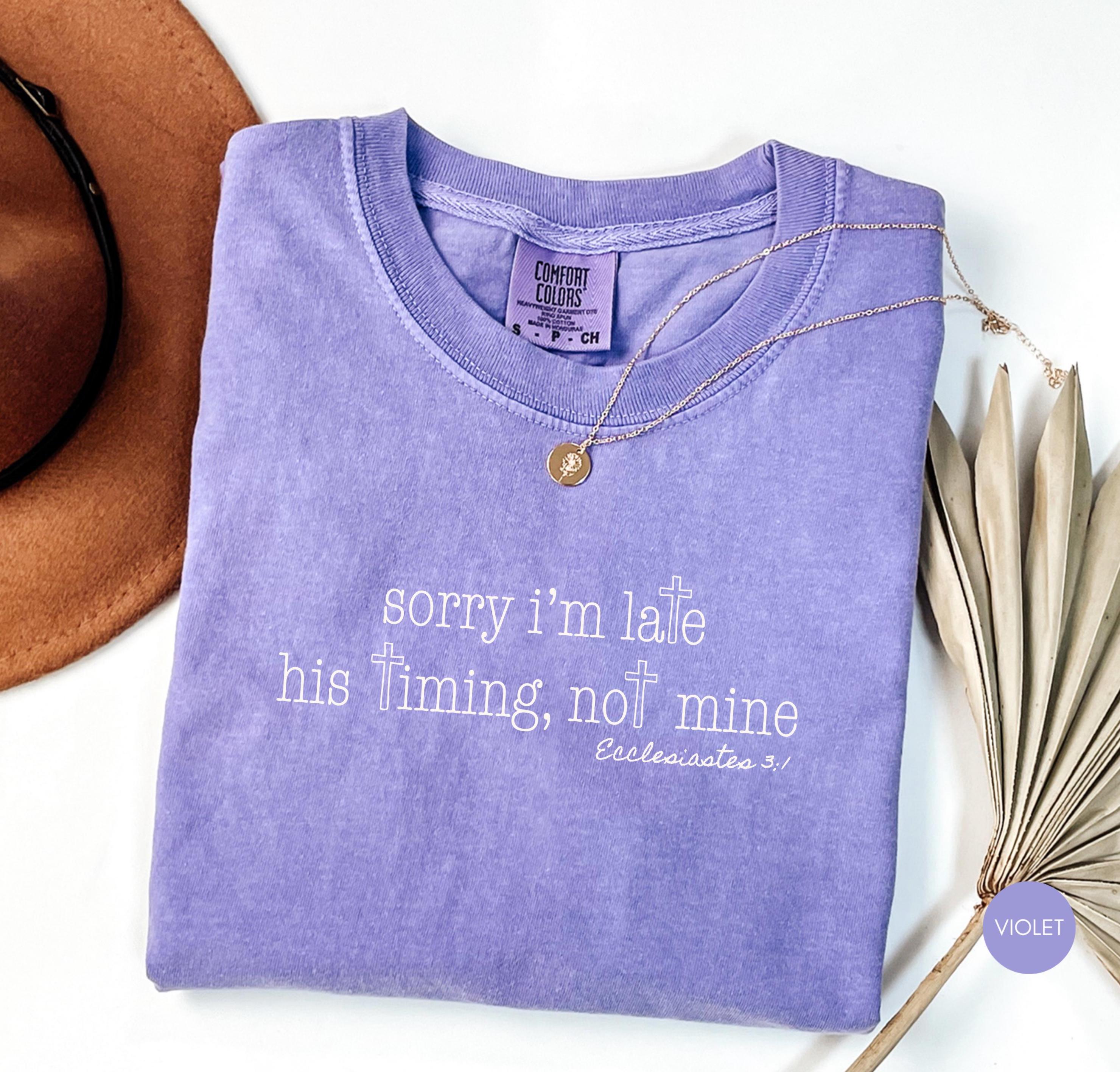 Comfort Colors® 1717 Unisex Christian Shirt - "Sorry I'm Late His Timing Not Mine" Bible Verse Tee, Perfect Gift for Faithful Men & Women by SwiftPOD