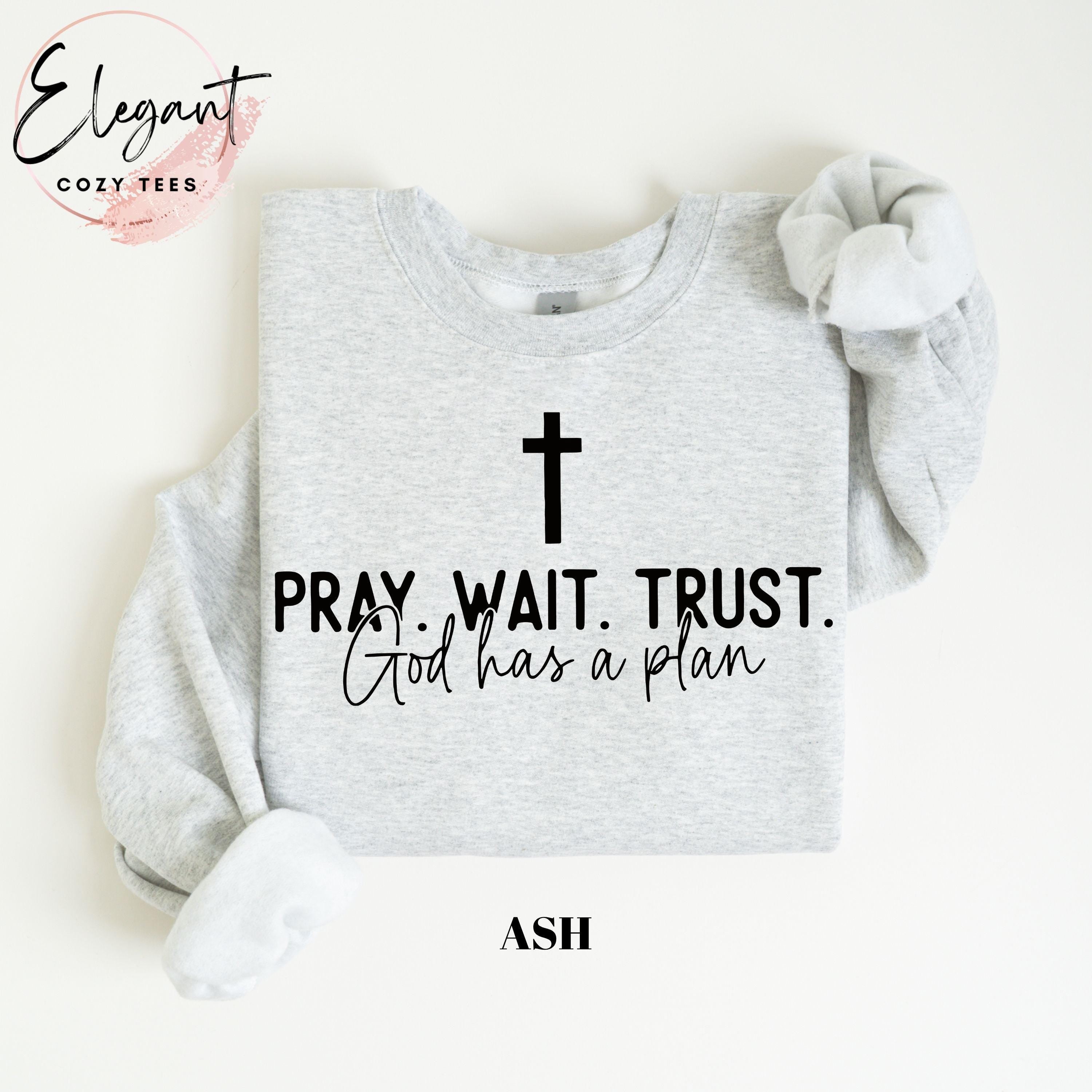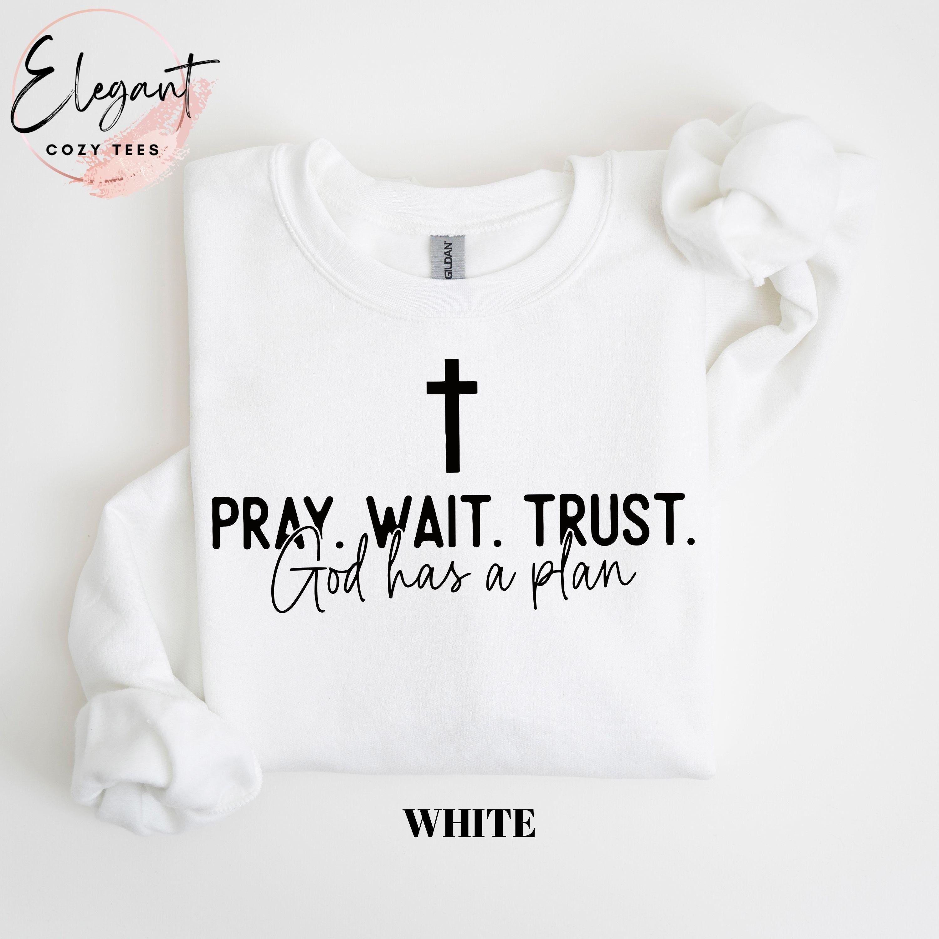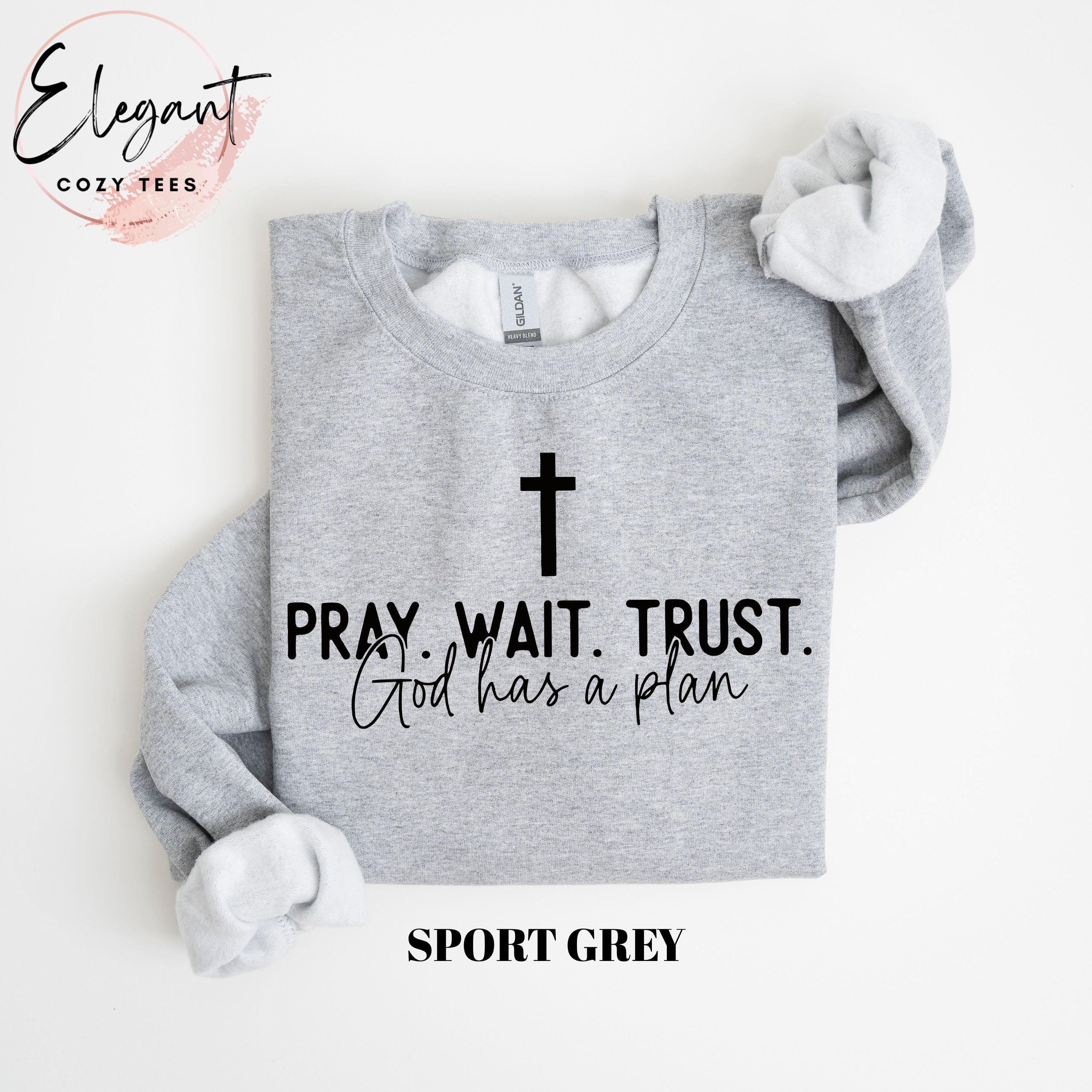 Cozy Gildan 18000 Sweatshirt for Women - Pray Wait Trust God Design, Perfect Christian Gift, Thanksgiving Aesthetic, Durable Unisex Fit, Printify Choice, God Is Good Religious Outfit