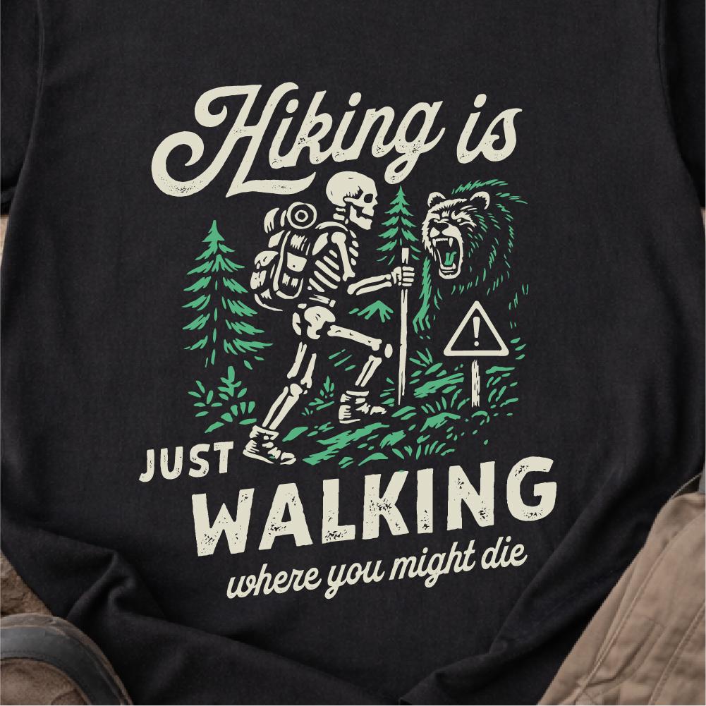 Hiking Is Just Walking Where You Might Die Shirt, Skeleton Hiker Funny Hiking Tee, Gildan 5000 Classic Tee, camping gift for men women