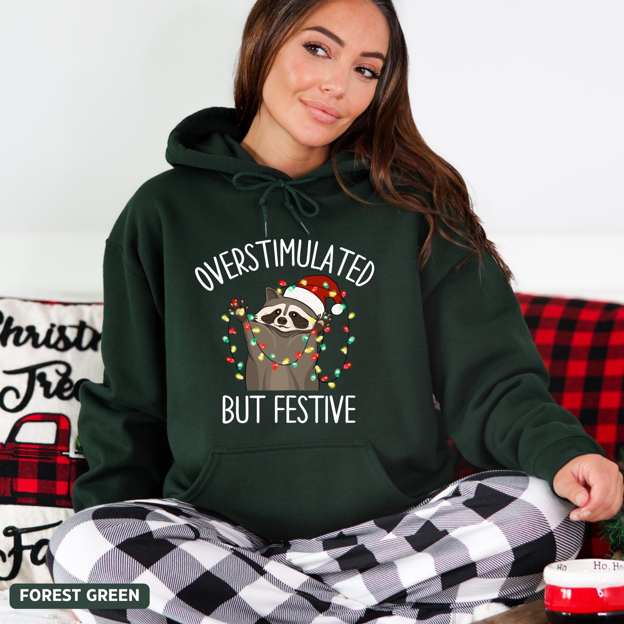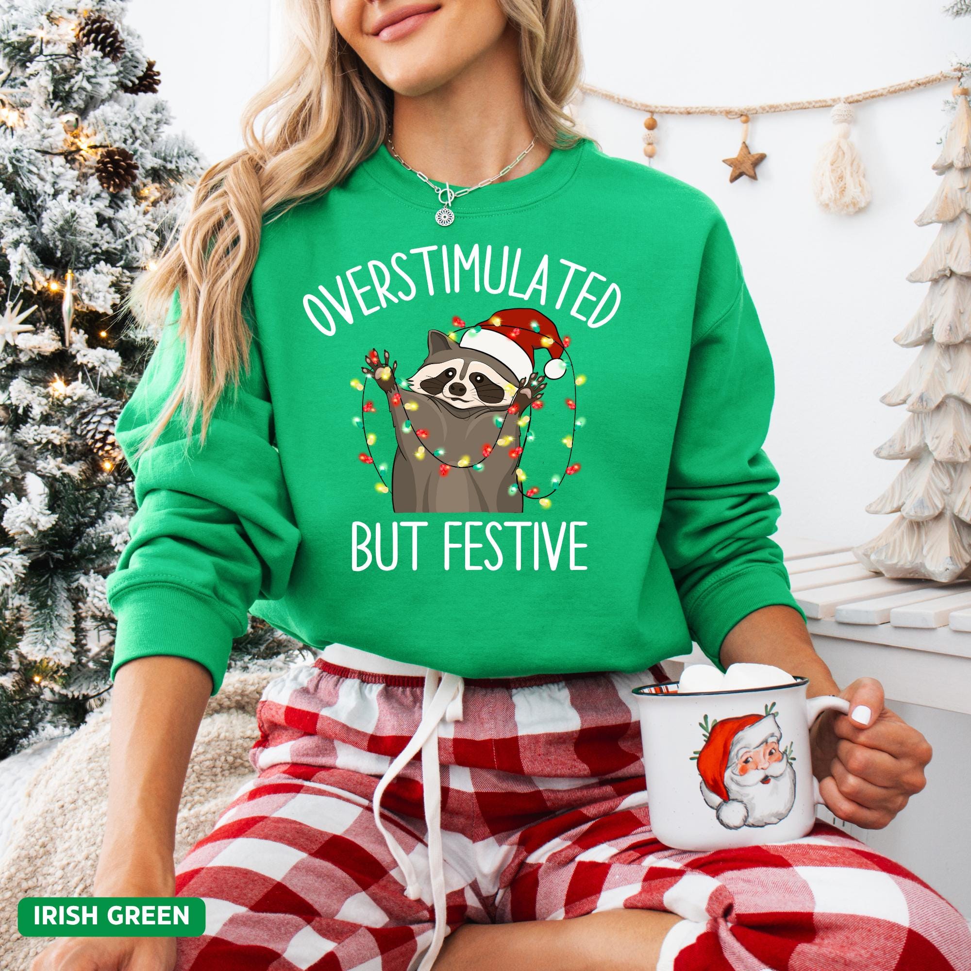 Overstimulated But Festive Racoon Christmas Sweatshirt for Women, Gildan 18000, Cozy Unisex Gift, Funny Meme Crewneck, Printify Choice Holiday Outfit